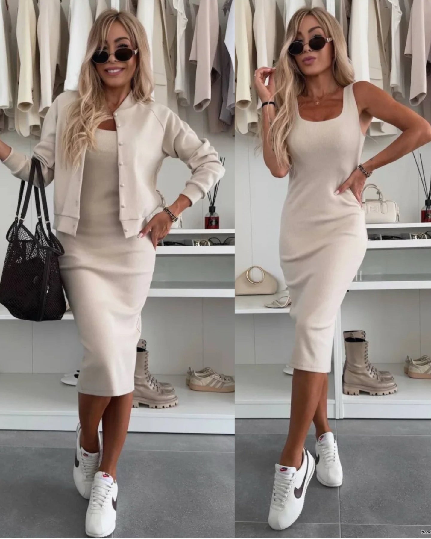 The Milena™ set combines the refined elegance of a fitted midi dress with the modern practicality of a bomber jacket. The ribbed fabric gently follows the curves, while the jacket adds a sporty and versatile touch. Perfect for tackling each day in style and comfort – from the office to leisure time.