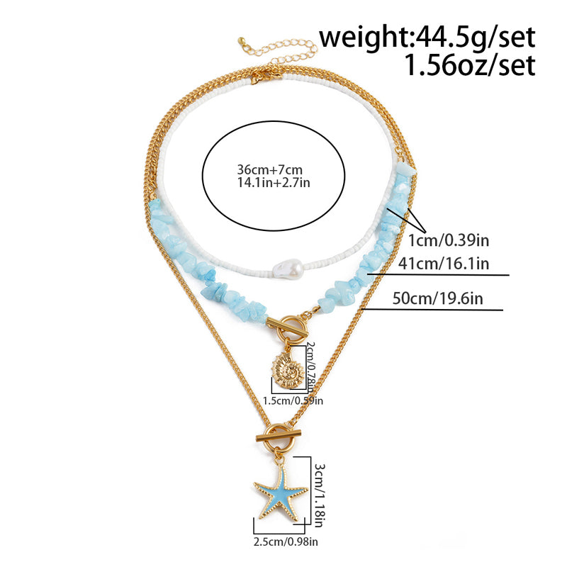 The necklace Maris combines three layers in a stylish design: white pearls with a shell look, turquoise stones, and golden pendants in the shape of the sun and a starfish. This piece of jewellery instantly brings a holiday mood and a maritime charm to your outfit. Ideal for summer, beach days, or as a special accent to simple looks.